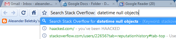 It might be well known fact, but I just discovered it to myself. StackOverflow has a nice feature together with Chrome. If you looking for some information, just start typing stackoverflow.com in Chrome URL bar, as soon as Chrome will suggest you to use http://stackoveflow.com press tab and you will see a prompt to put your query. Just create your query and press enter and you will get results directly from StackOverflow site. It seems a very nice and useful feature, since I frequently use StackOverflow as source of information.